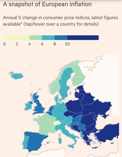 Një e treta e 27 anëtarëve të BE-së kanë përjetuar inflacion dyshifror, veçanërisht Estonia, ku çmimet e konsumit po rriten me një normë vjetore prej gati 19 për qind. Kryeministri i Polonisë, Mateusz Morawiecki, ka filluar t’i referohet “Putinflacionit” teksa kërkon të fajësojë pushtimin e presidentit rus Vladimir Putin për çmimet më të larta.