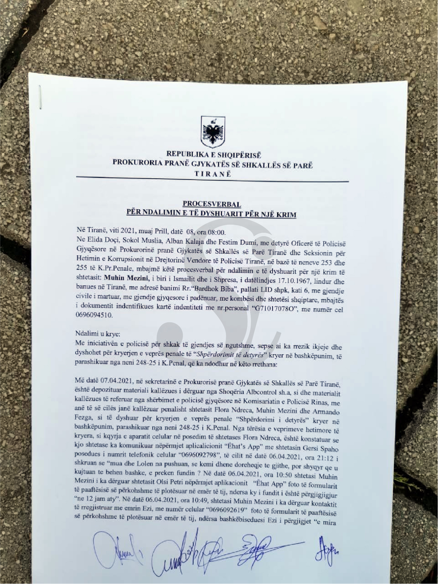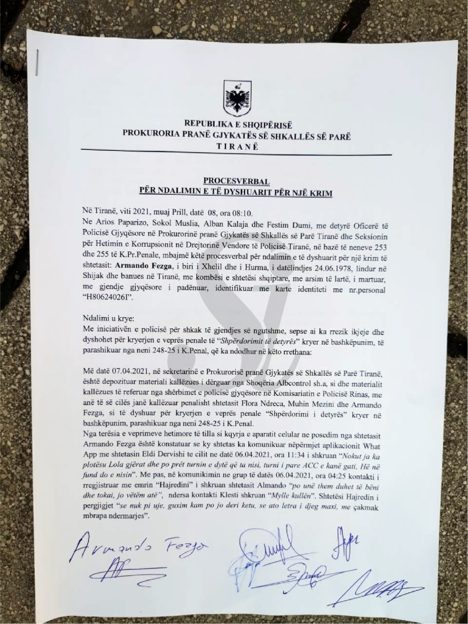 Sipas prokurorisë, një tjetër i arrestuar, Armando Fezga, komunikon me Eldi Dervishin dy ditë më parë, 6 prill rreth orës 11:34, ku i shkruan: “Nokut ja ka plotësuar Lola gjërat dhe po pret turnin e dytë që ta nisi, turni i parë ACC e kanë gati. Hë në fund do e nisin”.