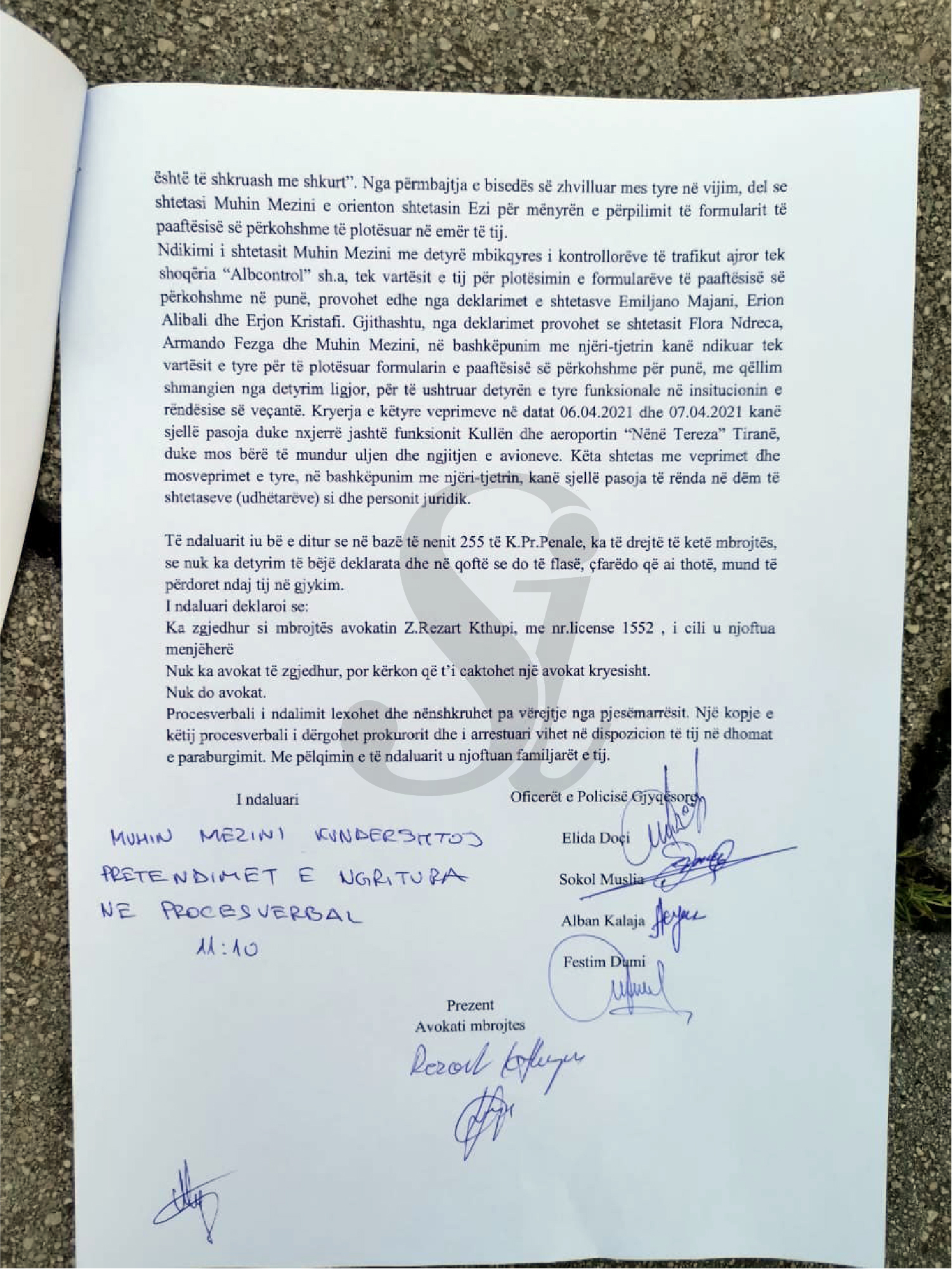 Prokuroria thotë se një prej tyre, Muhin Mezini, me detyrë mbikëqyrës i kontrollorëve të trafikut ajror, ka ndikuar te vartësit e tij për plotësimin e formularëve të paaftësisë së përkohshme në punë, fakt të cilin e kanë konfirmuar në polici edhe Emiljano Majani, Erion Alibali dhe Erjon Krisafi.