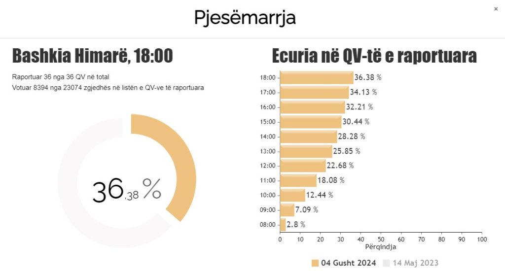 Sipas Komisionit Qendror të Zgjedhjeve, deri në orën 18:00, pjesëmarrja ka qenë 8.394 votues nga 23.074 zgjedhës në listën e qendrave të votimit të raportuara, pra 36.38 %.