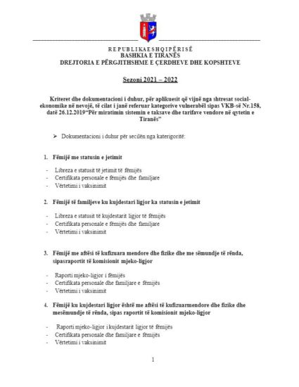 Drejtoria e Përgjithshme e Çerdheve dhe Kopshteve bën me dije se në datat 01-15 Shtator 2021, ora 09:00-14:00, do të kryhet procedura e aplikimit për regjistrim në kopshtet publike të Bashkisë Tiranë. Aplikimi do të kryhet pranë kopshtit ku synohet të regjistrohet fëmija.