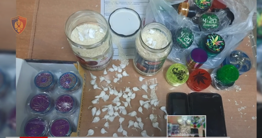 Atij iu gjetën në total 88 doza me lëndë narkotike kokainë, 40 grirëse bimore si ato që përdoren për përgatitjen e kanabisit, qese dhe sende të tjera që përdoreshin për përgatitjen dhe shitjen e kokainës. Tashmë 26-vjeçari i arrestuarit akuzohet për veprën penale “Prodhimi dhe shitja e lëndëve narkotike”