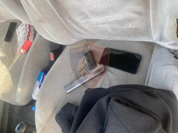 Gjatë kontrollit në automjet, policia gjeti dhe sekuestroi në cilësinë e provës materiale një armë zjarri pistoletë dhe municion luftarak.