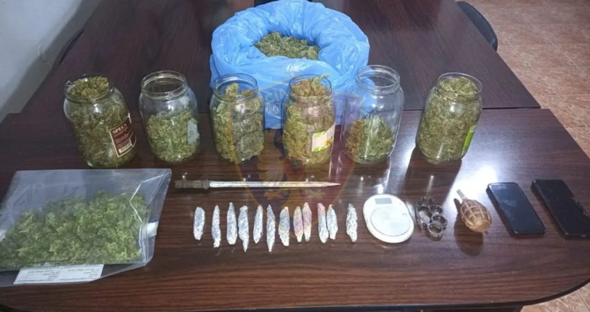 Në banesën e tyre janë gjetur dhe sekuestruar 6.8 kg lëndë narkotike kanabis sativa, një pjesë e të cilës ishte e ndarë në doza gati për shitje, një peshore elektronike që shërbente për ndarjen e lëndës narkotike në doza, një granatë difensive me detonator të montuar, një bajonetë arme zjarri, një përforcues grushti, dy aparate celularë dhe një automjet tip “BMW”.