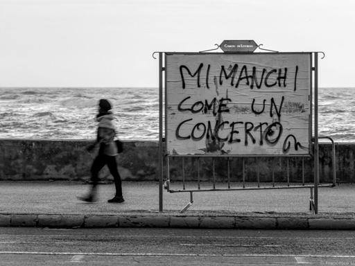 Pankarta është bërë ditët e fundit, fotoja menjëherë më pas. Dhe falë mediave sociale, por edhe këngëtarëve të ndryshëm që e kanë ripostuar, ajo është bërë virale dhe simbolike. Jemi në Livorno, në rrethrrotullimin e Ardenzës, të shkruar në një pankartë që normalisht do të kishte pritur një poster shfaqjesh, dhe në të cilin tani dominojnë këto fjalë: “Më mungon si një koncert”. Një shkrim që shpreh të gjithë boshllëkun kulturor të këtyre muajve të pandemisë. Fotoja më pas u ripostua nga Emma Marrone, Lo Stato Sociale, Tiziano Ferro, Zen Circus dhe shumë muzikantë të tjerë italianë.