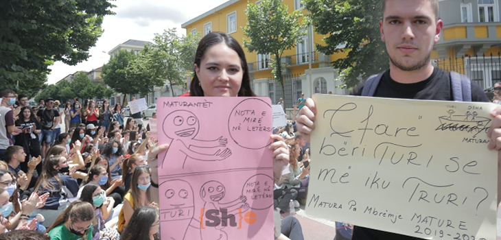 E ndërkaq, përpara Ministrisë së Arsimit, disa dhjetëra maturantë zhvilluan edhe sot një tjetër protestë. Një grup prej tyre ishte nisur nga Kamza në këmbë në drejtim të Tiranës. “Mos na digjni pasaportën e së ardhmes!”, “Dikur ëndërroja mjekësinë, sot ëndërroj Lopedinë”, ishin disa nga parrullat e reja që ata mbanin në duar. Pasi iu bashkuan grupit tjetër përpara Ministrisë, maturantët bënë përsëri thirrje që testi i Letërsisë të rivlerësohet. Që prej të premtes, kjo e sotshmja ishte protesta e tretë e maturantëve, të cilët për rreth dy orë bllokuan edhe qarkullimin e Rrugës së Durrësit. Rreth orës 13.00 protesta e tyre u mbyll me premtimin se do të kthehen sërish nesër, pas përfundimit të provimit të maturës në matematikë.