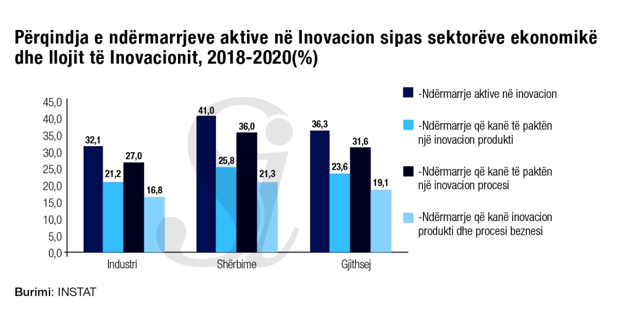 Gjatë periudhës 2018-2020, 23.6% e të gjitha ndërmarrjeve të vrojtuara zhvilluan inovacione të produkteve (mallra ose shërbime të reja ose të përmirësuara), ndërsa 31.6% zhvilluan procese biznesi të reja ose të përmirësuara.