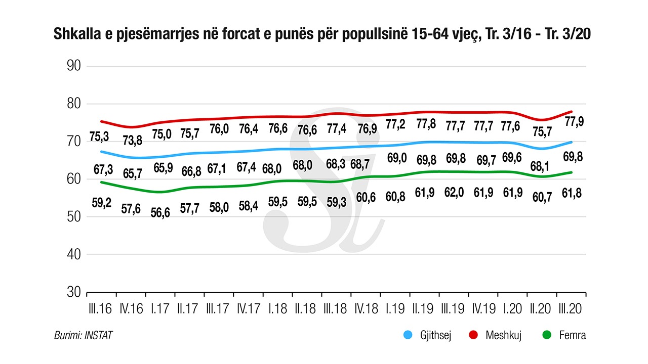 Të dhënat më të fundit të INSTAT për tregun e punës tregojnë se në tremujorin e tretë 2020, shkalla e pjesëmarrjes në forcat e punës për të rinjtë e moshës 15-29 vjeç është 53,3 %. Për popullsinë 30-64 vjeç, në tremujorin e tretë 2020, shkalla e pjesëmarrjes në forcat e punës është 78,2 %.