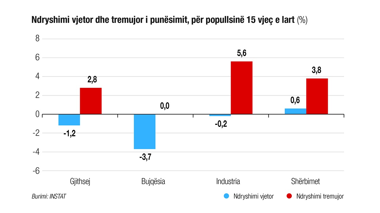 Sipas INSTAT në tremujorin e tretë 2020, shkalla e punësimit për popullsinë 15-64 vjeç është 61,3 %. Gjatë këtij tremujori, në krahasim me të njëjtin tremujor të vitit 2019, numri i të punësuarve gjithsej u ul me 1,2 %, ndërkohë krahasuar me tremujorin e dytë të vitit 2020, ky tregues u rrit me 2,8 %.