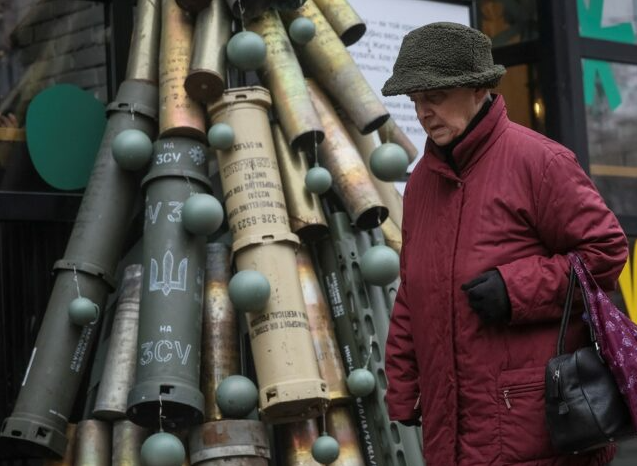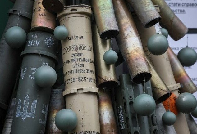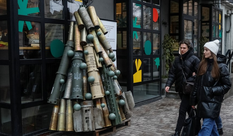 Predha artilerie të përdorura dhe pjesë të raketave nga vija e frontit janë përdorur për të krijuar një pemë simbolike të Krishtlindjes në kryeqytetin e Kievit.