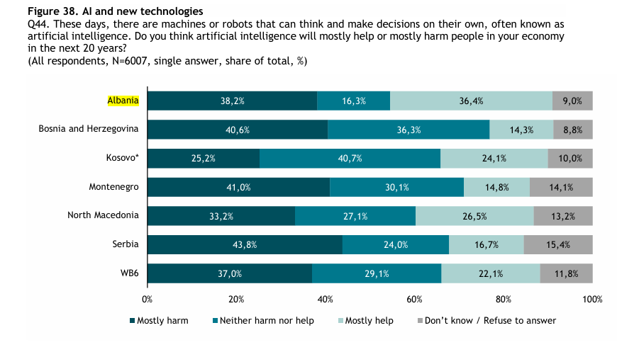 Skepticizmi mbi inteligjencën artificiale është i përhapur në të gjtihë rajonin, tregon anketa. Bosnja dhe Hercegovina (40.6%), Mali i Zi (41%) dhe Serbia (43.8%) kanë më shumë frikë për zhvillimet e AI-së, megjithëse perceptimet pozitive kanë pasur përmirësime të lehta krahasuar me vitin 2024. Ndërkohë, Maqedonia e Veriut tregon një ndarje të qartë: 33.2% besojnë se AI do të dëmtojë njerëzit, 27.1% janë neutralë dhe 26.5% shohin AI-në si të dobishme.