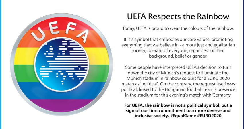 Në fillim një “Jo” e thatë ndaj propozimit për ngjyrosjen e “Allianz Arenës”, pastaj logoja me ylber: UEFA në një postim në Tuiter ka shpjeguar se “është krenare të mbajë ngjyrat e ylberit. Është një simbol që mishëron vlerat tona thelbësore, duke promovuar gjithçka ku ne besojmë: një shoqëri më e drejtë dhe e barabartë, tolerante me të gjithë, pavarësisht nga e shkuara, besimi dhe gjinija”.