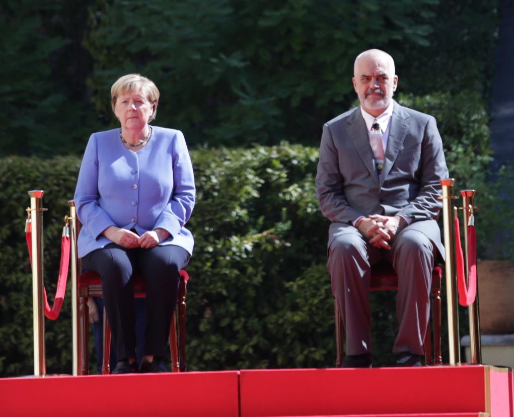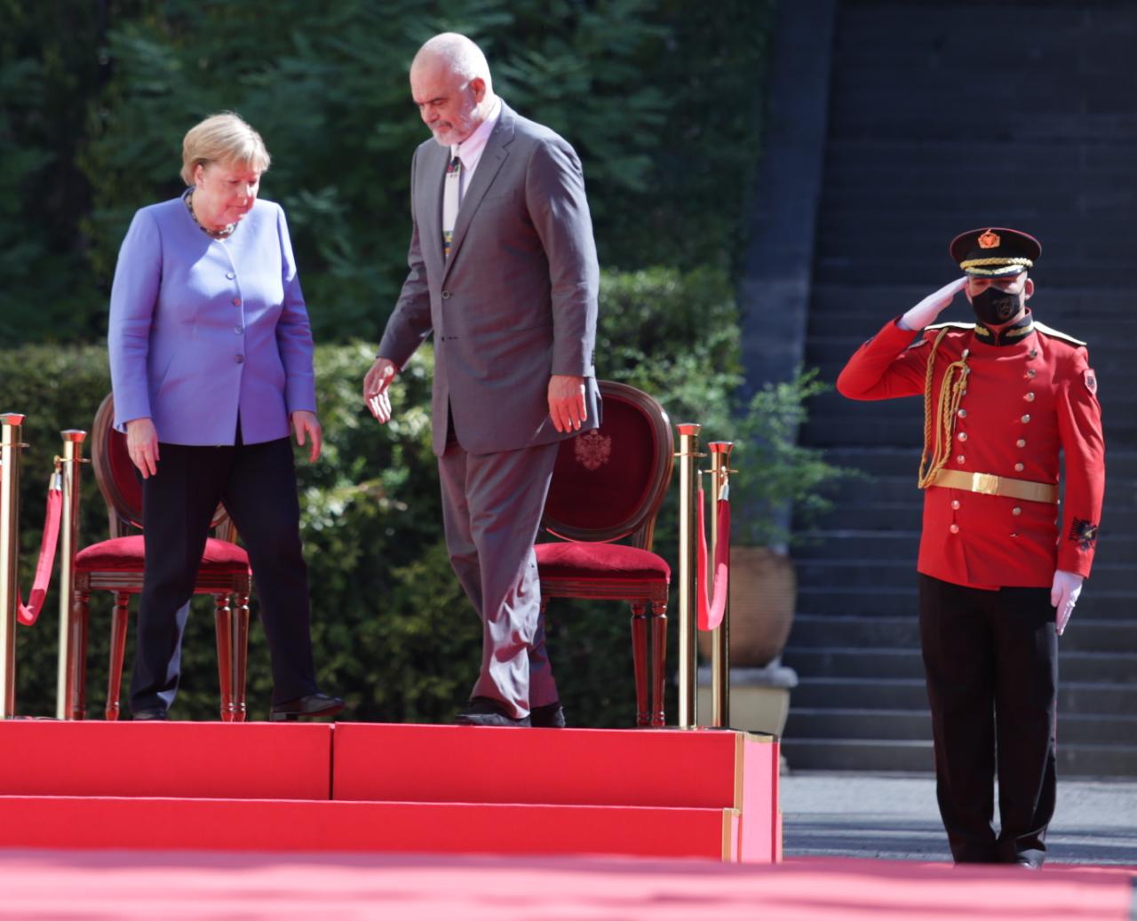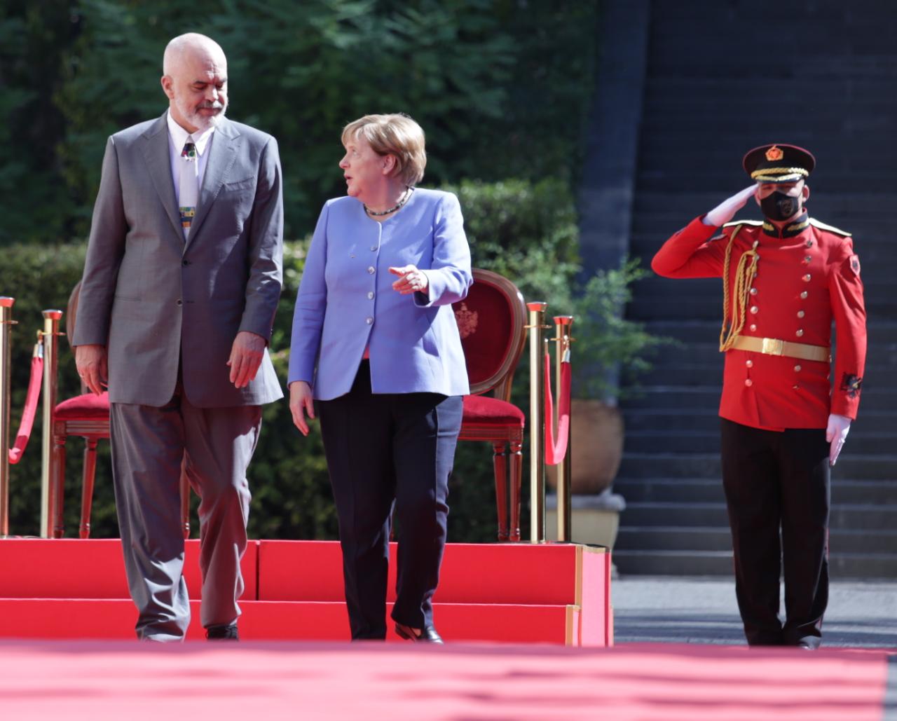 Kryeministri Edi Rama ka pritur me një ceremoni shtetërore kancelaren gjermane Angela Merkel në Pallatin e Brigadave në Tiranë.