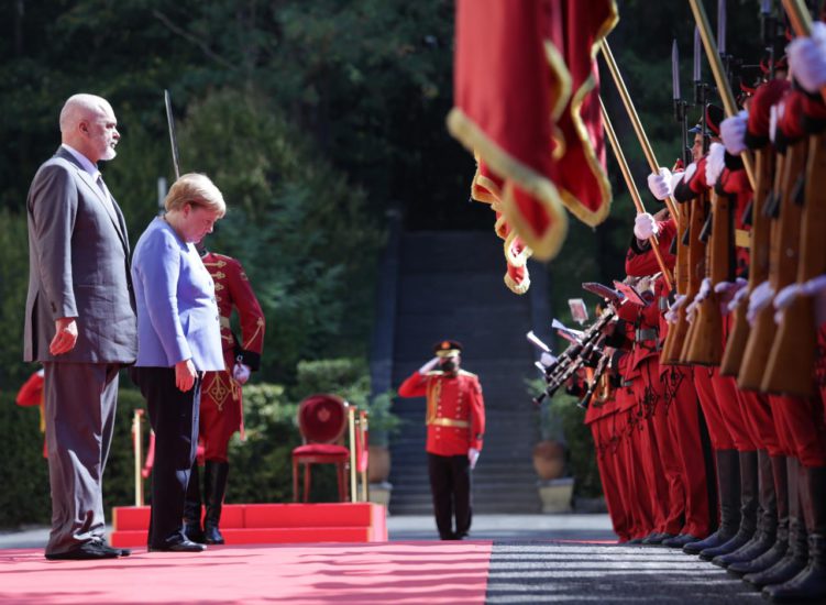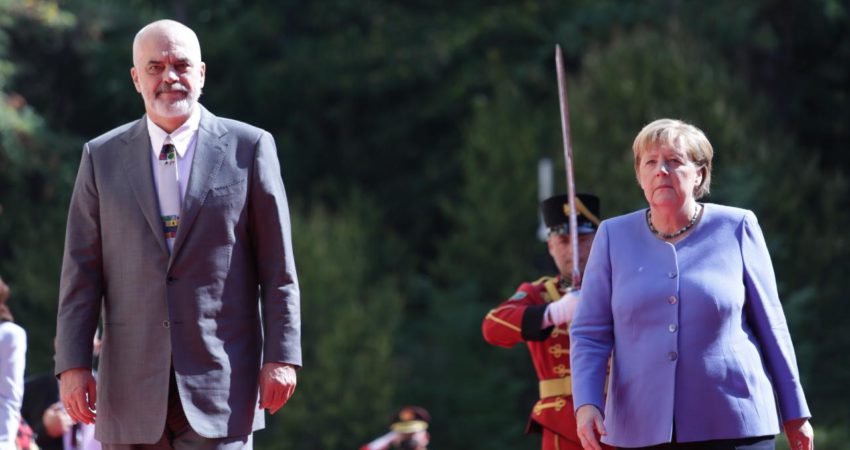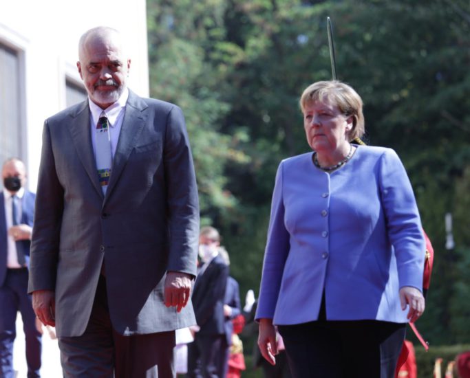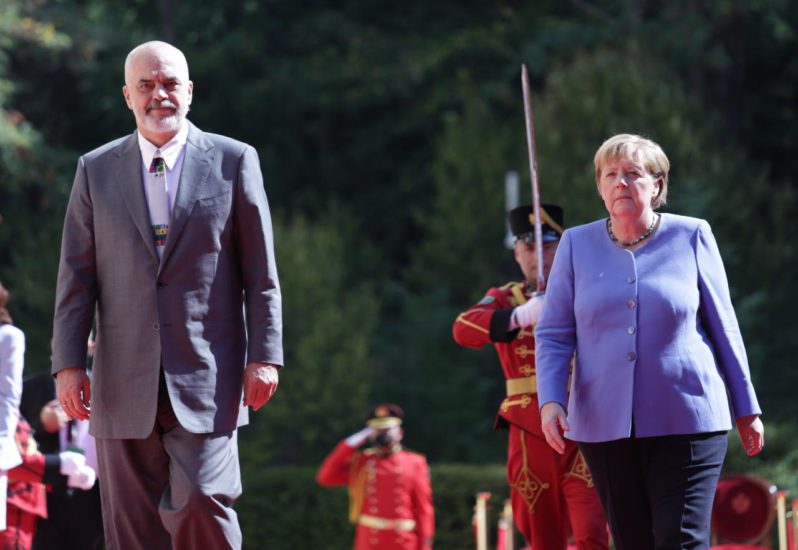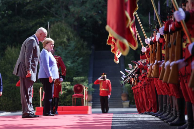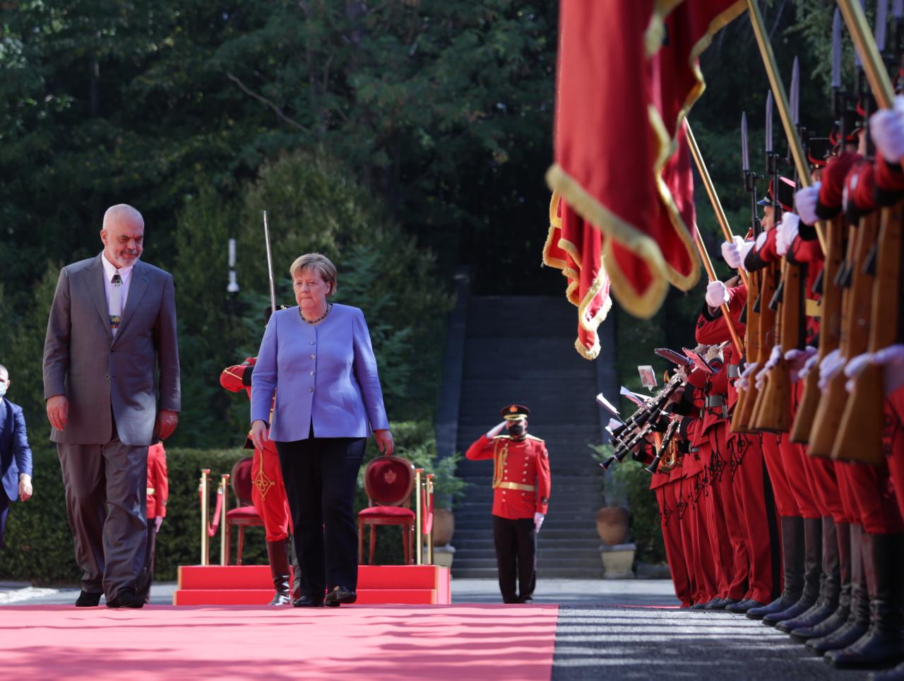 Kryeministri Edi Rama ka pritur me një ceremoni shtetërore kancelaren gjermane Angela Merkel në Pallatin e Brigadave në Tiranë.