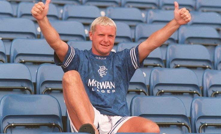 Në kohën kur luante me Gllasgou Rejnxhërs, Gaskoin ka dhënë më të mirën e vet. Pas një goli në “Old Firm”, futbollisti anglez festoi duke bërë shenjën e flautit ndaj tifozëve të Selltikut. Një tallje për festimet protestante dhe sigurisht që tifozët kundërshtarë nuk e pritën mirë. Nuk kanë munguar edhe shakatë e tij në lojë të ndaluar. Kjo foto tregon si tallet me një lojtar kundërshtar, kur loja është e ndaluar.