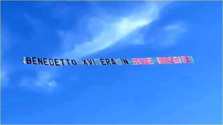 Në një mesazh tjetër të ngjashëm të shfaqur mbi vijën bregdetare të Lazios më 16 korrik, shkruhej: “Benedikti XVI nuk abdikoi vërtet”.