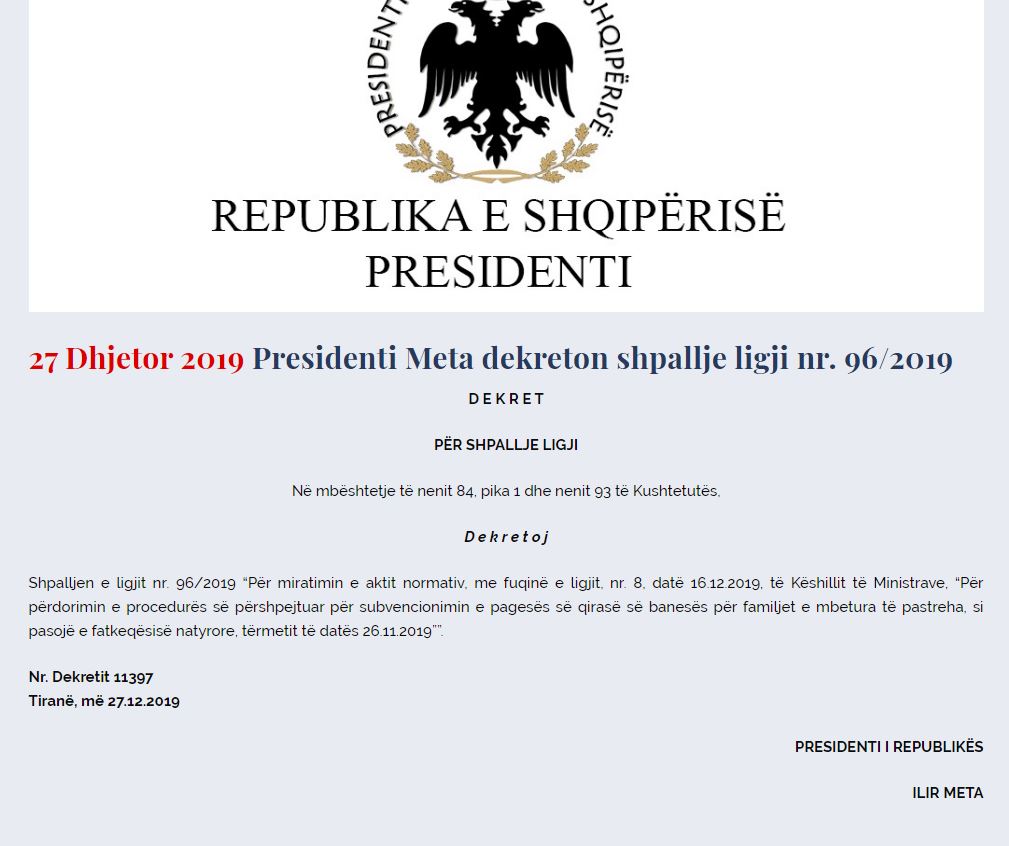 Kështu, Presidenti ka dekretuar ligjin “Për përdorimin e procedurës së përshpejtuar për subvencionimin e pagesës së qirasë së banesës për familjet e mbetura të pastreha, si pasojë e fatkeqësisë natyrore të 26 nëntorit”, si dhe ligjit “Për përballimin e pasojave të fatkeqësisë natyrore”.