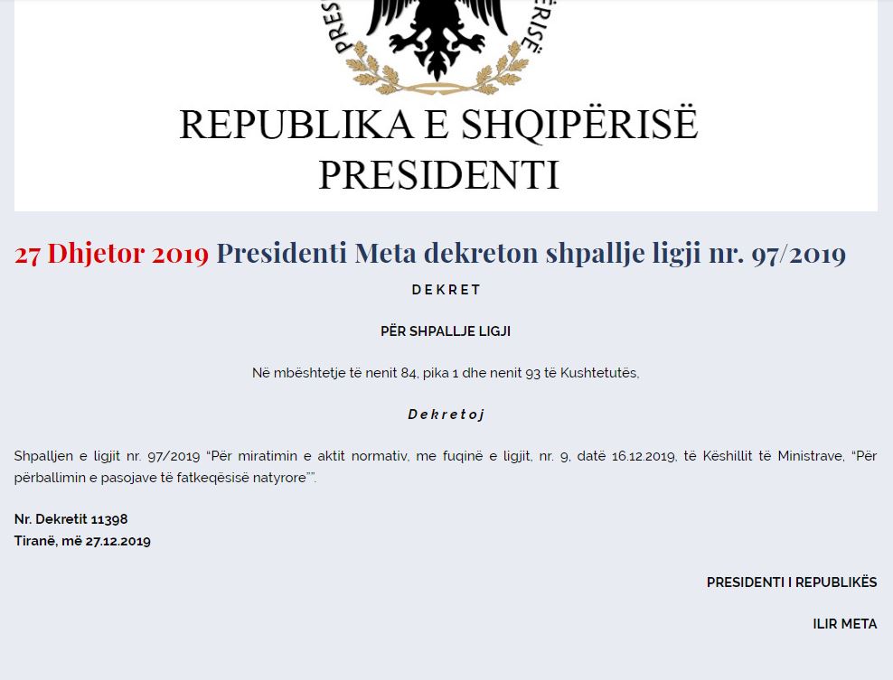 Presidenti Ilir Meta ka dekretuar sot 3 ligje të rëndësishme, që lidhen me tërmetin e fuqishëm të 26 nëntorit që u shoqërua me një bilanc tragjik.