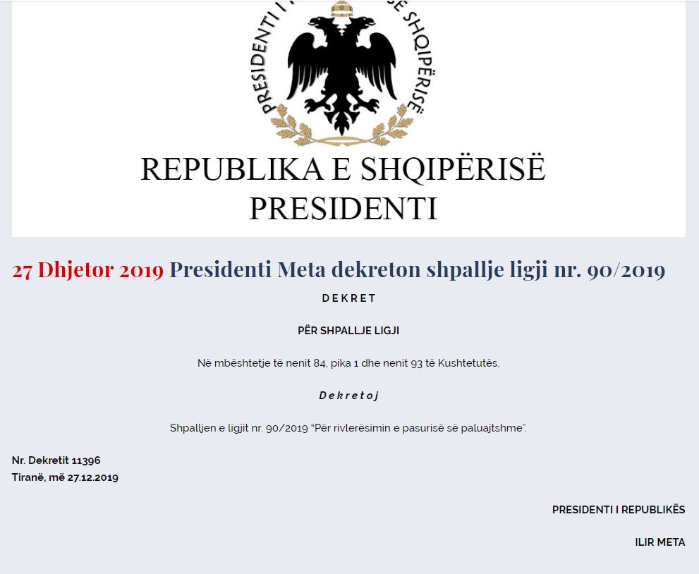 Gjithashtu, Presidenti Meta ka dekretuar edhe ligjin “Për rivlerësimin e pasurisë së paluajtshme”.
