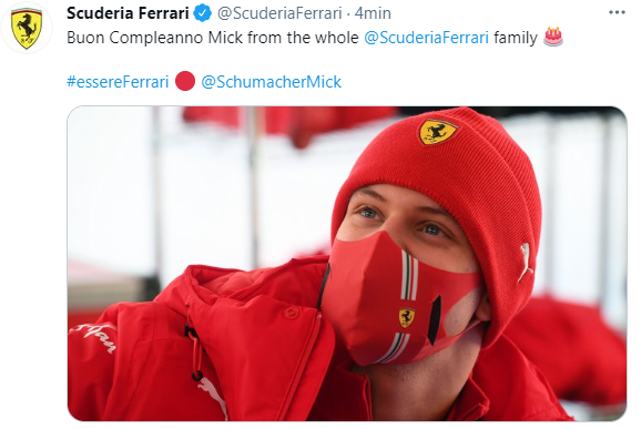 Kuptimin e thellë dhe emocional Mick e zbuloi në faqen e tij personale. Kujtimi i shtatë titujve të fituar nga Michael në harkun e njëmbëdhjetë sezoneve midis 1994 dhe 2004 (dy me Benetton, pesë – radhazi – me Ferrari), një rekord i barazuar vitin e kaluar nga Lewis Hamilton. Vetë Ferrari e uroi atë me një foto të Mick me një uniformë të kuqe: tani për tani “vetëm” si një anëtar i Ferrari Driver Academy. Në të ardhmen, kush e di …!