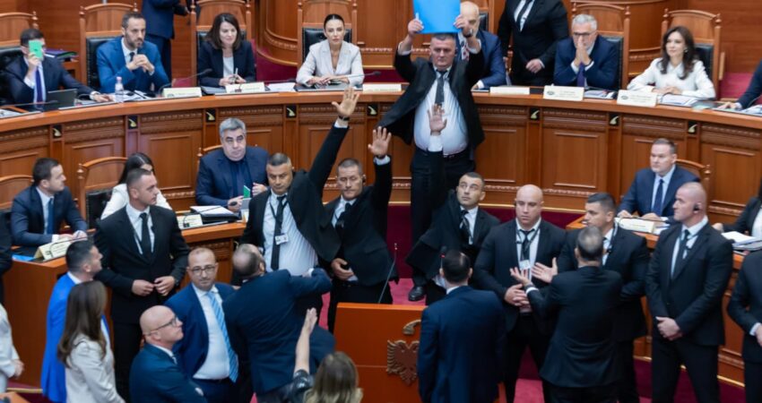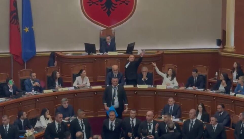 Teksa mazhoranca po votonte, deputetët e opozitës hodhën shishe dhe letra drejt kreut të kuvendit dhe kryeministrit.