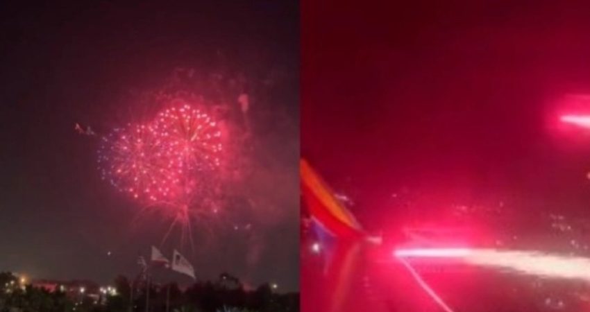 Një pamje mahnitëse që tregon momentin kur një aeroplan është i rrethuar nga një shfaqje verbuese e fishekzjarreve ka marrë vëmendjen e rrjeteve sociale.