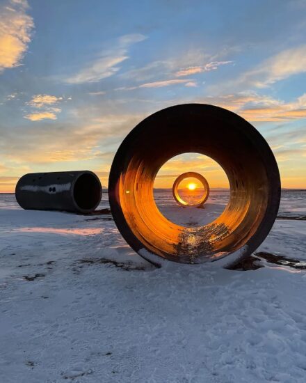 Pamja përmes Tuneleve të Diellit të Nancy Holt në Utah e kornizon në mënyrë të përsosur Diellin ndërsa lind dhe perëndon