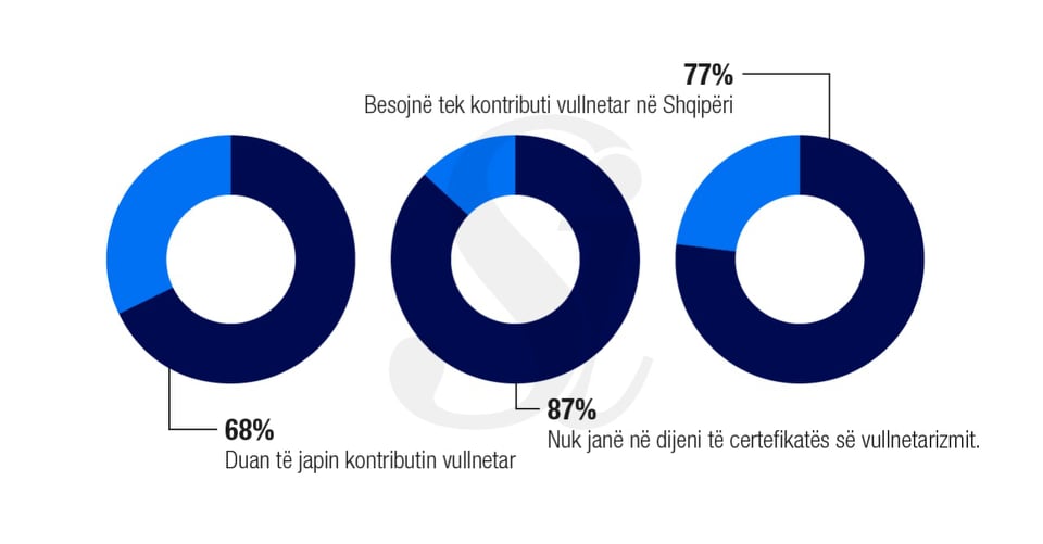 Nga rreth 1100 njerëz të pyetur që nga mosha 15-65 vjeç rezulton se pjesa më e madhe (77%) besojnë se kontributi vullnetar në Shqipëri është shumë i nevojshëm. Sipas të dhënave të studimit pjesa më e madhe e të anketuarve (87%) nuk janë në dijenitë ekzistencës