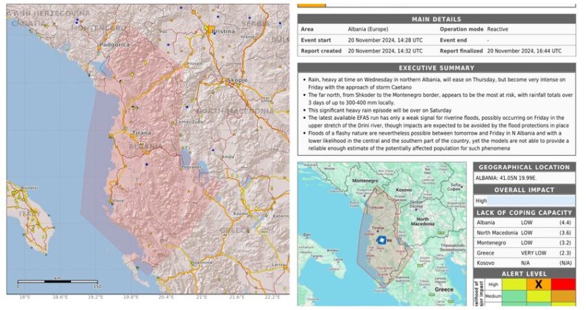 “Mot me reshje të dendura pritet gjatë ditëve në vijim, kryesisht në veri të vendit. Bazuar në informacionin e dërguar nga Qendra e Koordinimit të Emergjencave Civile në Bruksel, Instituti i Gjeoshkencave dhe Shërbimi Meteorologjik Ushtarak, të premten, më 22 Nëntor, priten reshje “intensive” deri “shumë intensive” në qarqet Shkodër, Kukës, Dibër, Tiranë dhe Elbasan. Në qarqet e tjera priten reshje mesatare, të cilat lokalisht mund të arrijnë deri në nivelin “intensive”.”