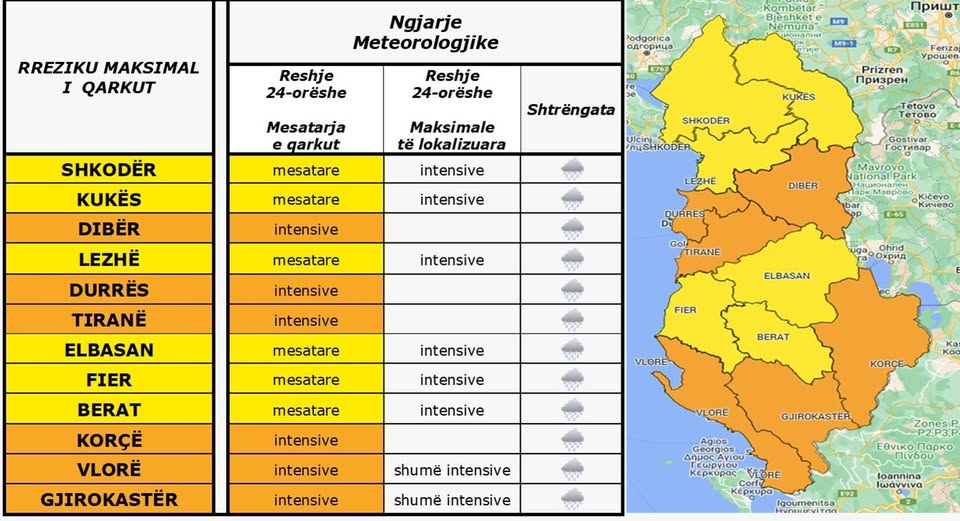 Nga Gazeta ‘Si’- Agjencia Kombëtare e Mbrojtjes Civile ka paralajmëruar qytetarët se nesër(12 janar) priten reshje intensive, kryesisht në qarqet Vlorë, Gjirokastër, Dibër, Durrës, Tiranë dhe Korçë, si dhe reshje dëbore në zonat malore mbi 300 m.