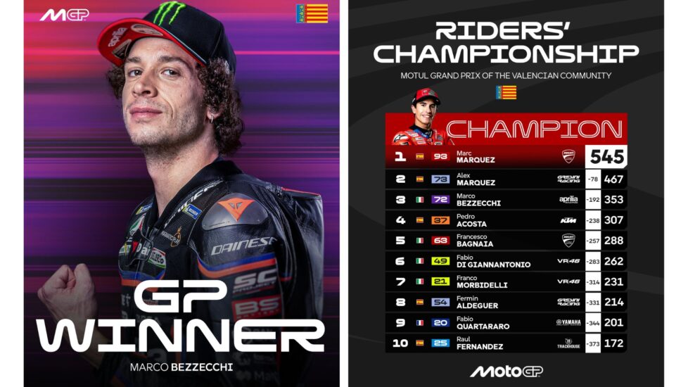 Kjo u shkon më së miri planeve për Aprilia-n, teksa Marco Bezzecchi (Aprilia Racing) siguroi një fitore nga starti në finish në Valencia.