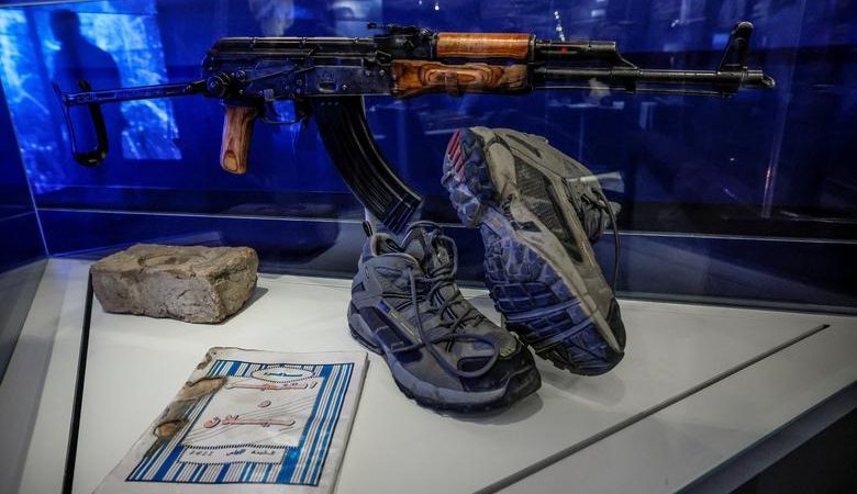 Një pushkë AKM DHE këpucë që u gjendën pranë trupit të Osama bin Laden natën që ai u vra në kompleksin e tij në Pakistan nga Amerika.