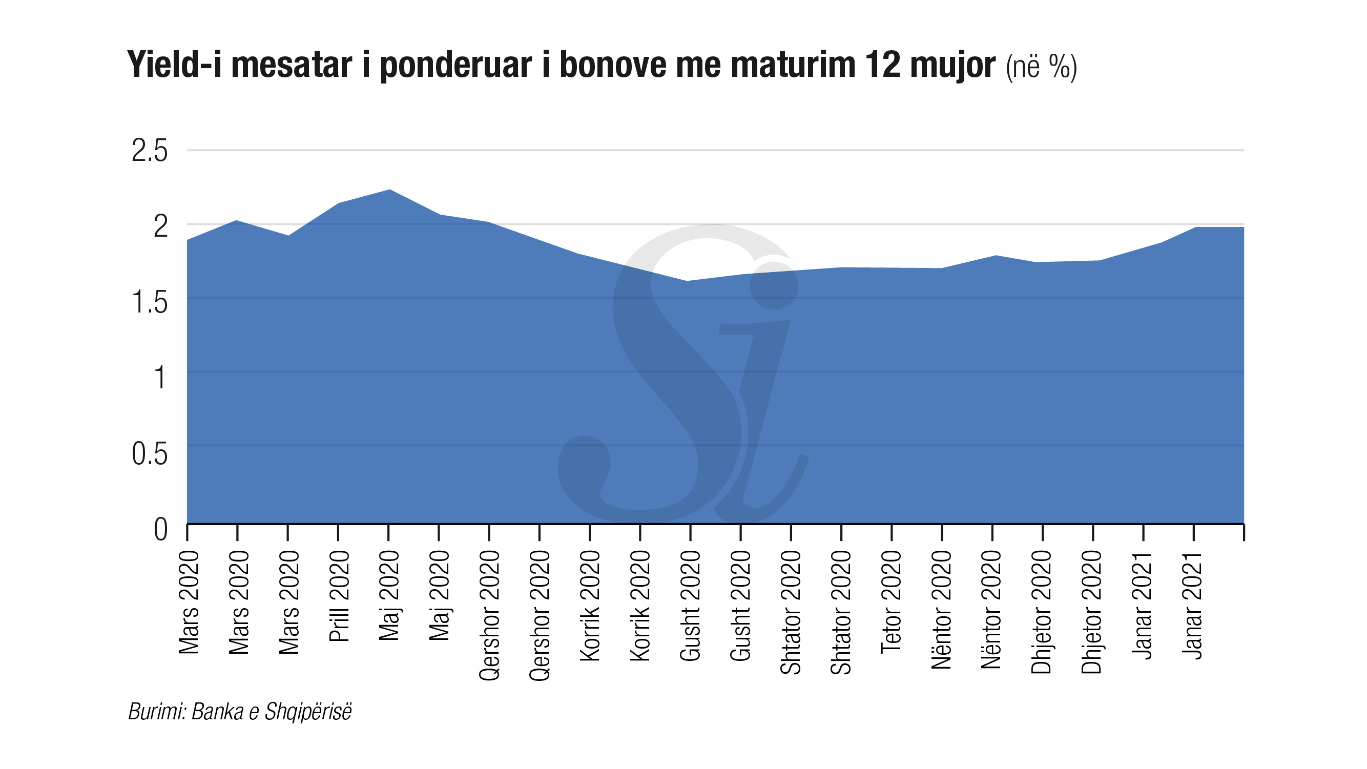 Banka e Shqipërisë ka publikuar rënien e nivelit të yield-eve të bonove 12 mujore. Yield-i mesatar i ponderuar qëndroi në të njëjtin nivel si 3 muaj më parë në ankand, 1.99%.