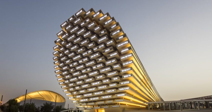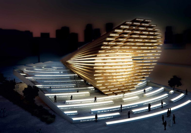 Fjalët shfaqen, nëpërmjet LED-ve, në pllaka druri të rregulluara në një rreth në njërin skaj të pavijonit në formë koni, i cili u projektua nga Es Devlin, një artiste britanike, puna e mëparshme e të cilës përfshin skena për Beyonce dhe Adele, si dhe Ceremonia e mbylljes së Lojërave Olimpike Londër 2012. Ajo është dizajnerja e parë femër e një pavioni që nga fillimi i Expo në 1851.