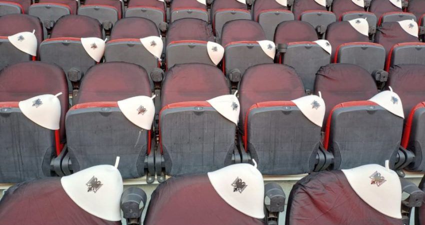 Në disa foto shihet se në të gjithë hapësirën e tribunës qendrore dhe asaj VIP janë vendosur qeleshe, që do të jenë në dispozicion të tifozëve që kanë zënë vendet aty për të shijuar spektaklin e kuqezinjve.