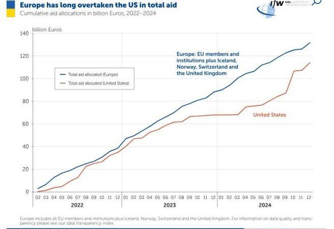 Në të vërtetë, Observatori i Kielit nënvizon se gjatë vitit 2023, Amerika ngadalësoi fluksin e ndihmave: “Ai u ul ndjeshëm për nëntë muaj, kur Kongresi i SHBA bllokoi çdo projektligj të ri ndihme. Ndihma e SHBA-së ka rifilluar muajt e fundit, por me kthimin e Presidentit Trump në detyrë, ndihma ushtarake e SHBA-së ka të ngjarë të ngecë përsëri”. Raporti përshkruan gjithashtu një ndryshim në mbështetjen e luftës së Perëndimit.