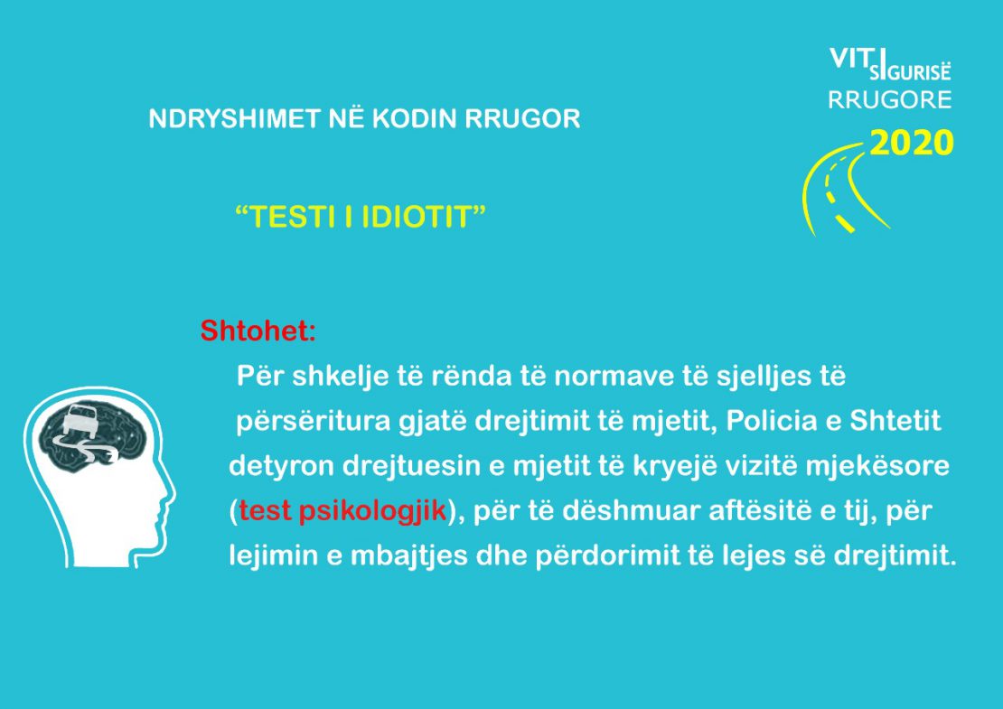 Sa i takon “testit të idiotit“, në Kodin Rrugor shtohet: Për shkelje të rënda të normave të sjelljes të përsëritura gjatë drejtimit të mjetit, Policia detyron drejtuesin e mjetit të kryejë vizitë mjekësore (test psikologjik) për të dëshmuar aftësitë e tij, për lejimin e mbajtjes dhe përdorimit të lejes së drejtimit.