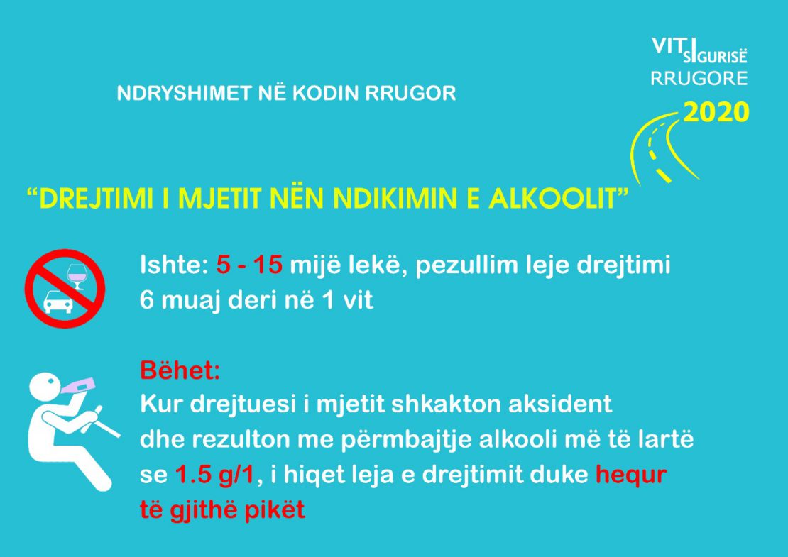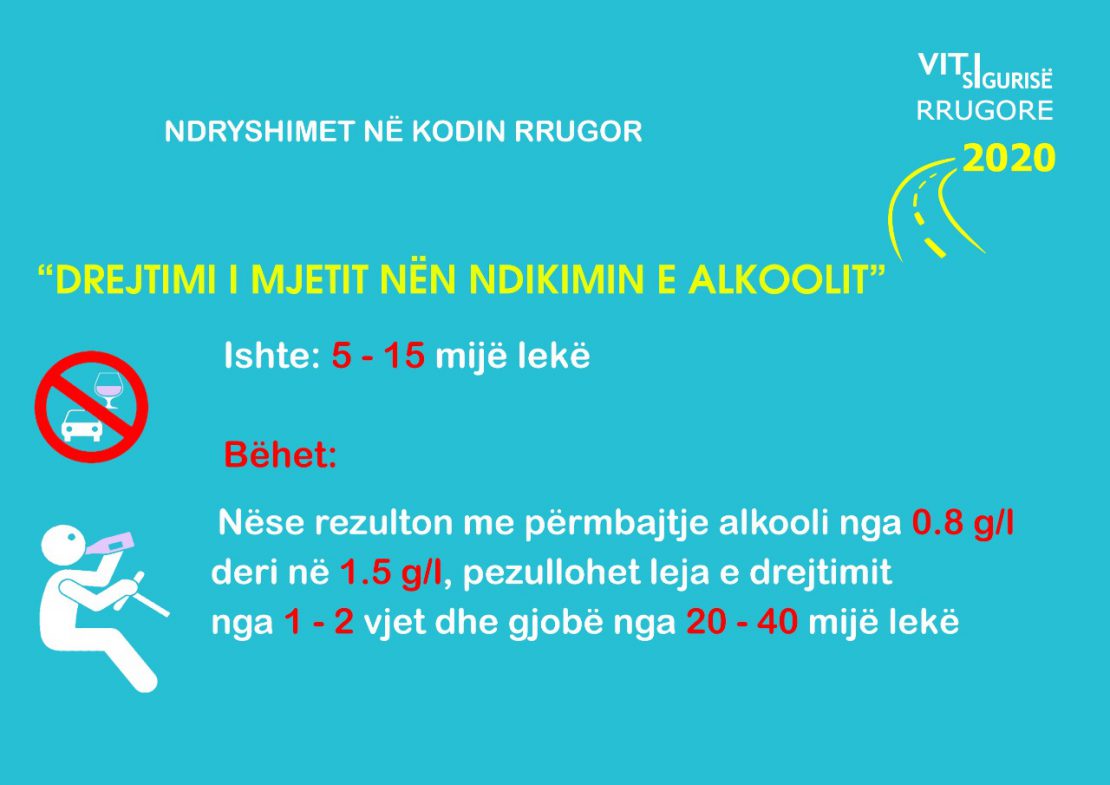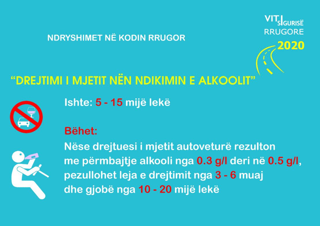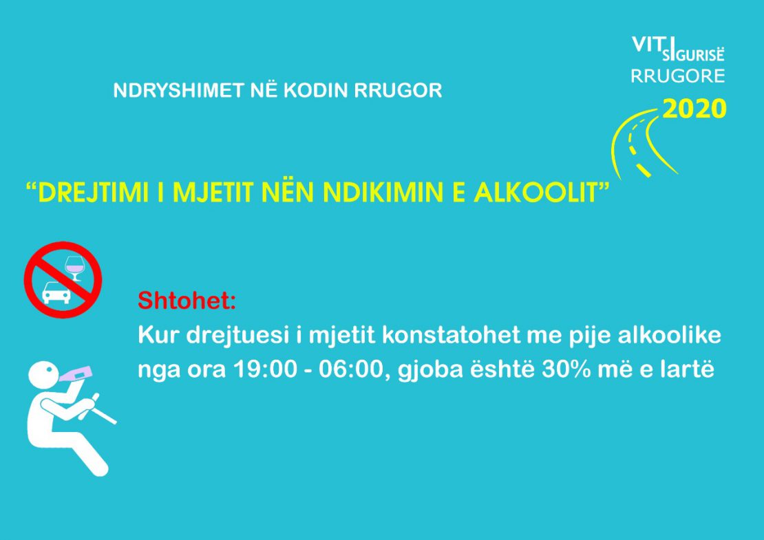 Gjithashtu nëse drejtuesi i mjetit konstatohet me pije alkoolike, nga ora 19:00-06:00, gjoba është 30% më e lartë.