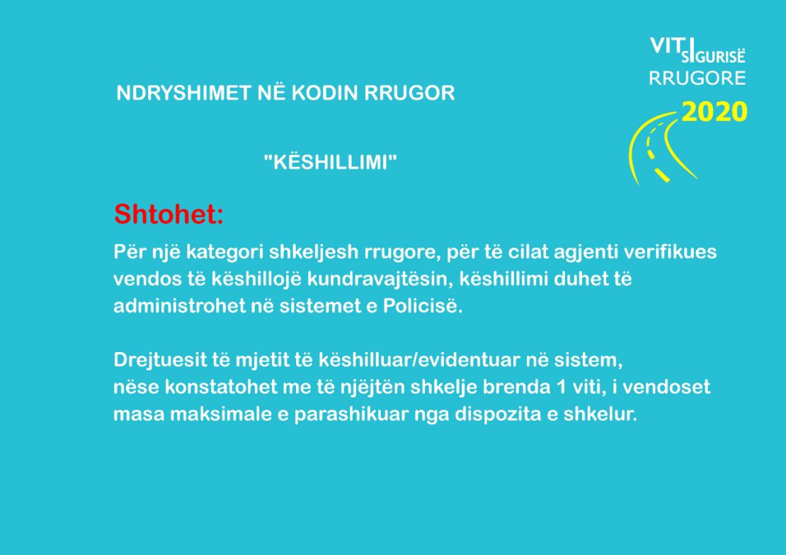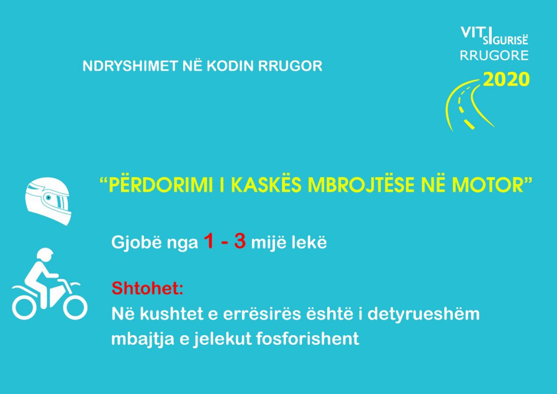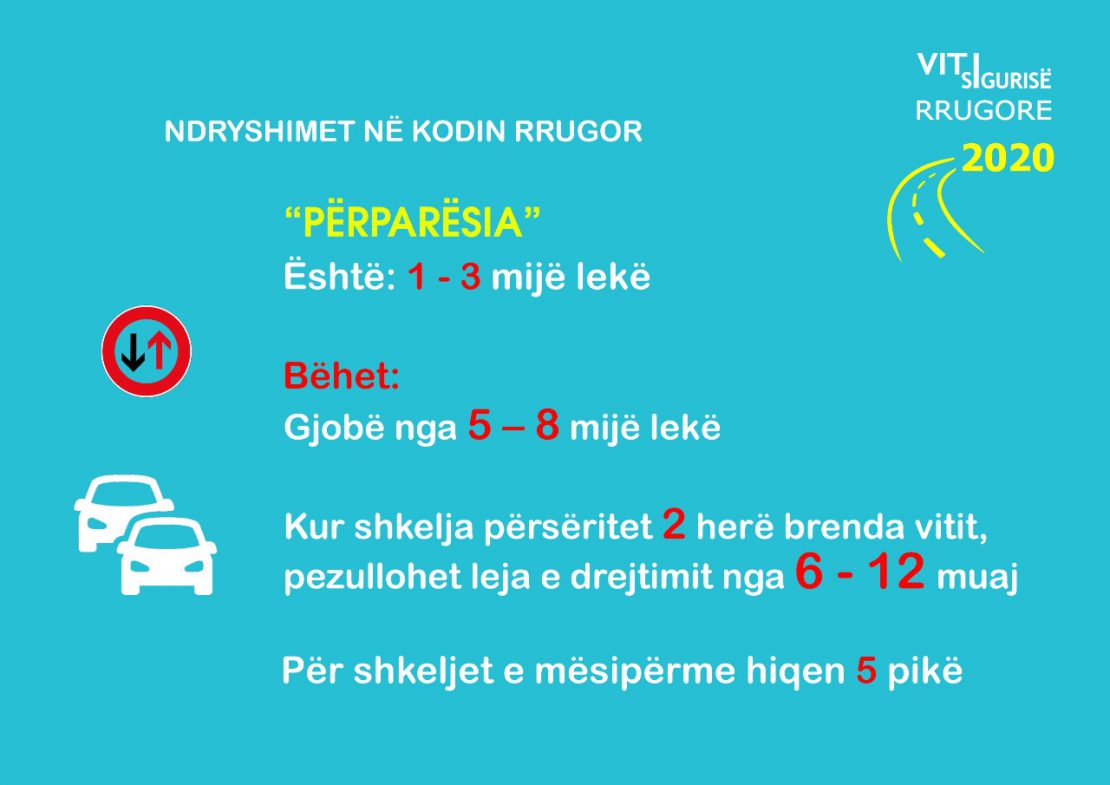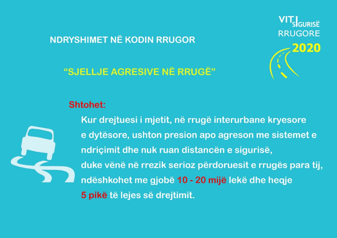 Një tjetër ndryshim i propozuar është gjoba 10-20 mijë lekë dhe heqje 5 pikë nga leja e drejtimit kur shoferi nuk ruan distancën e sigurisë dhe ushtron presion me sistemet e ndriçimit në rrugë interurbane kryesore e dytësore.