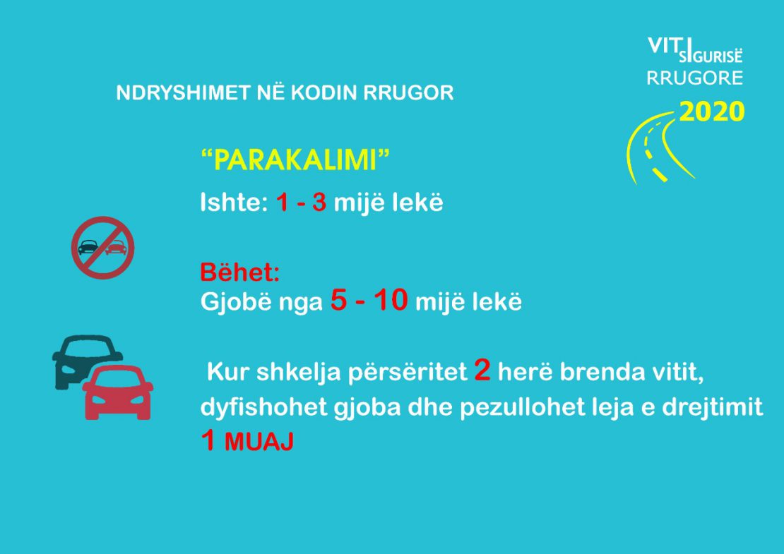 Gjoba për parakalimet nga 1-3 mijë lekë bëhet 5-10 mijë lekë dhe nëse shkelja përsëritet dy herë brenda vitit, dyfishohet gjoba dhe pezullohet leja e drejtimit për një muaj.
