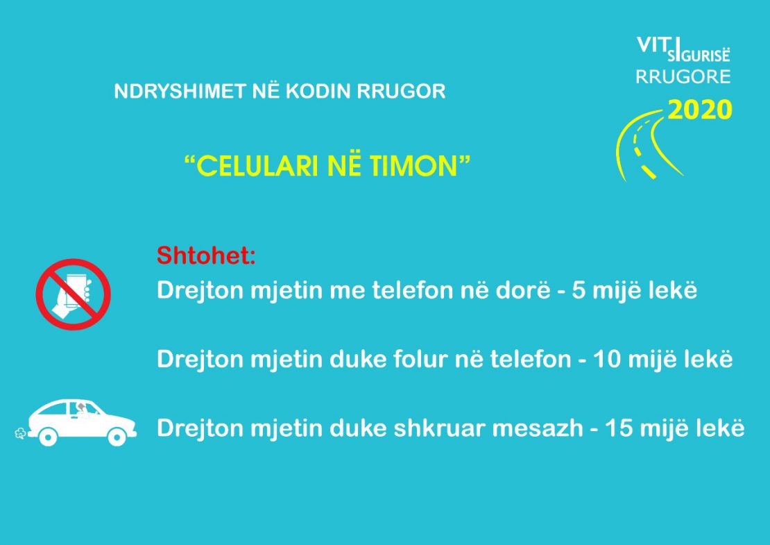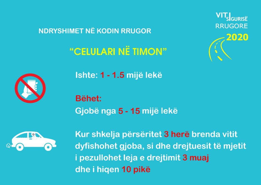 Ndërkohë, ka ndryshime edhe për përdorimin e celularit në timon, gjoba rritet nga 1-1.5 mijë lekë, në 5-15 mijë lekë. Dhe nëse shkelja përsëritet 3 herë brenda vitit, dyfishohet gjoba si dhe leja e drejtimit pezullohet për 3 muaj bashkë me zbritjen 10 pikë.