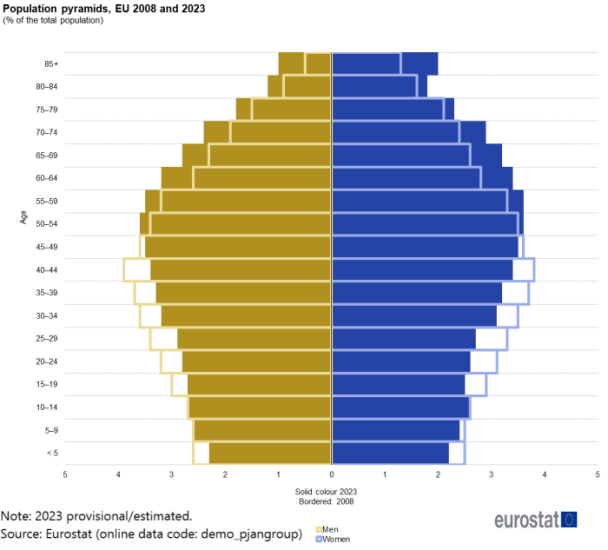 Eurostat tregon se e gjithë Europa po vuan nga plakja dhe mungesa e të rinjve, si efekt i rritjes së jetëgjatësisë dhe uljes së fertilitetit. Piramida e popullsisë është shndërruar në një romb dhe shumë shpejtë, ajo mund të jetë vetëm një trekëndësh.