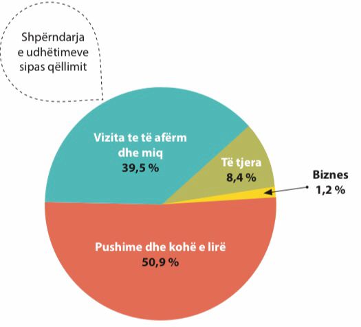 Udhëtimet për qëllime personale përbëjnë 98.8 % të udhëtimeve gjithsej, ndërsa udhëtimet për qëllime biznesi 1.2 % të tyre.
