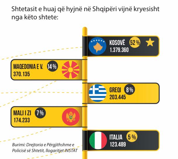 Hyrjet e shtetasve nga rajoni i Europës zënë pjesën më të madhe të hyrjeve të shtetasve të huaj me 98.5 % të totalit.