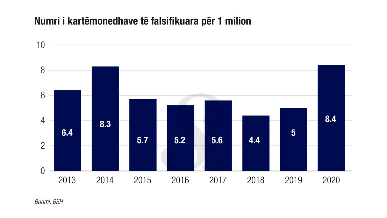 Megjithatë, në vlerësimin e BSH-së, koeficienti i kartëmonedhave të falsifikuara për 1 milion copë kartëmonedha në qarkullim ngelet në vlera të ulëta. Vitin e kaluar ky koeficient arriti në 8.4 për një milion kartmonedha, nga 5 për një milion që kishte qenë në vitin 2019.