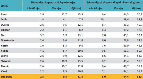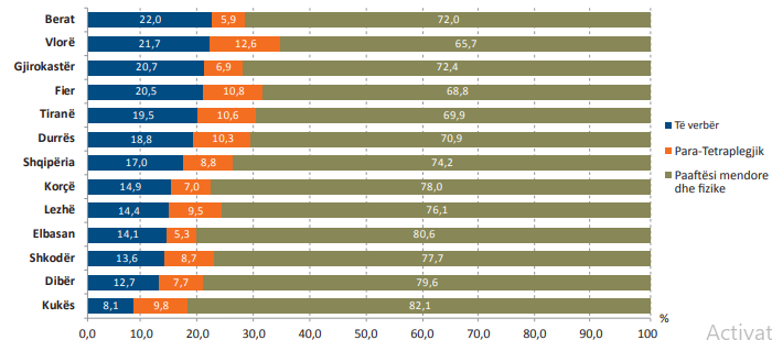 Numri më i lartë i personave me aftësi të kufizuar në raport me popullsinë është regjistruar në Qarkun e Elbasanit dhe të Gjirokastrës. Sipas llojit të aftësisë së kufizuar, profili në të gjithë qarqet është pothuajse i ngjashëm, mbi 60% e personave me aftësi të kufizuar të regjistruar janë të grupuar në kategorinë “Aftësi e kufizuar mendore dhe fizike”.