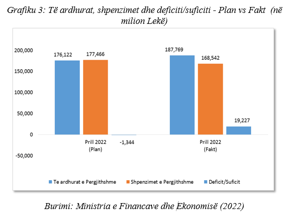 Niveli i suficitit për periudhën 4 mujore të vitit 2022 rezultoi në rreth 19.2 miliard LEK nga rreth 1.34 miliard lekë deficit i planifikuar. Krahasuar me të njëjtën periudhë të një viti më parë, ku niveli i deficitit rezultonte në masën prej rreth 14.8 miliard LEK, për periudhën 4 mujore të vitit 2022 vihet re një rritje e ndjeshme e nivelit të suficitit.