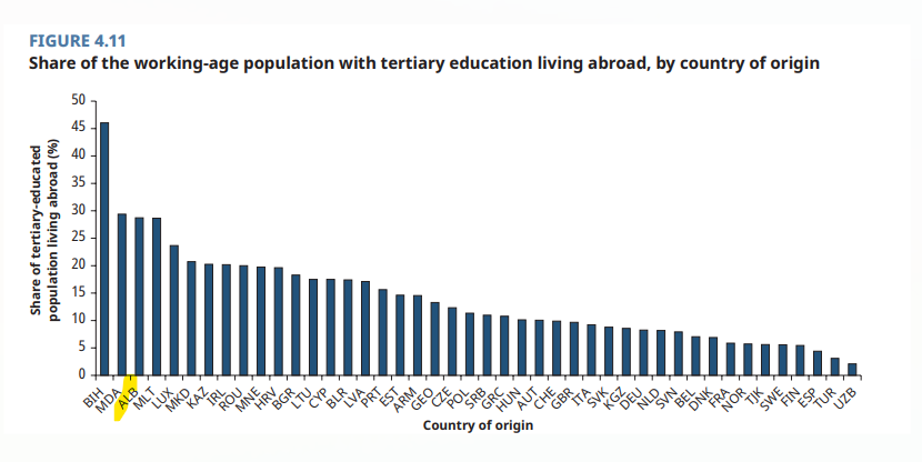 Organizata Botërore e Emigracionit përllogariti se 40% e forcës së punës në Shqipëri ka emigruar, ndërsa Banka Botërore raporton se nga Shqipëria ka ikur 30% e forcës punëtore me edukim të lartë, pra “truri”.