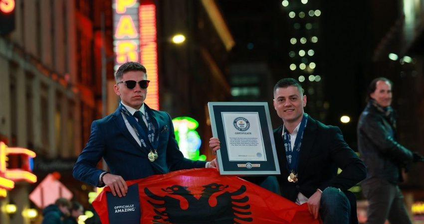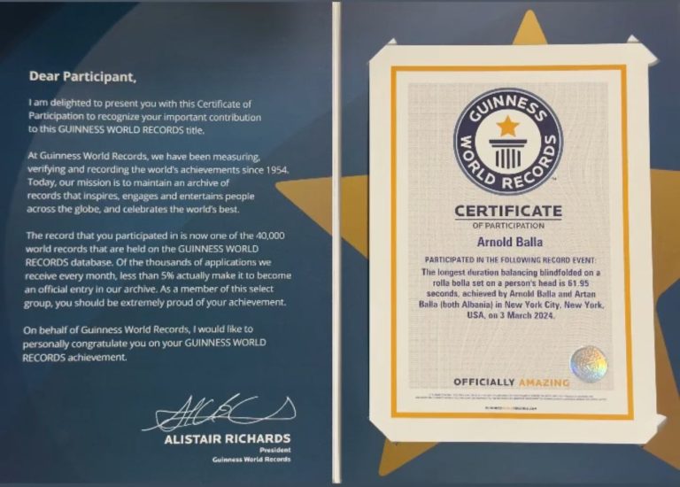 Nga Gazeta Si – Dy vëllezërit shqiptarë, Arnold dhe Artan Balla kanë vendosur rekord botëror për kohën më të gjatë të qëndrimit në ekuilibër me sy të mbyllur, në një cilindër.