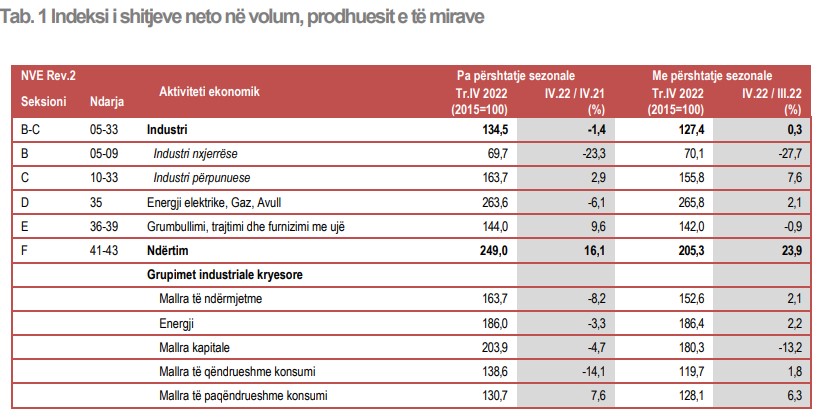 Ndërtimi ka vazhduar rritjen edhe në fund të vitit 2022, me rritje të prodhimit deri në 18.5% dhe të shitjeve me 16.1%. Të punësuarit u rritën me 2.3% dhe fondi i pagave me 17.3%.